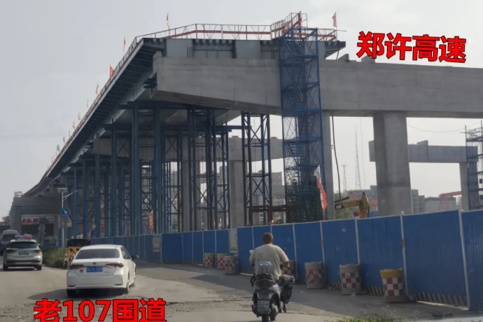 郭店收费站以北方向,郑许高速与老107国道线路重合,高速公路以高架桥的形式修建。