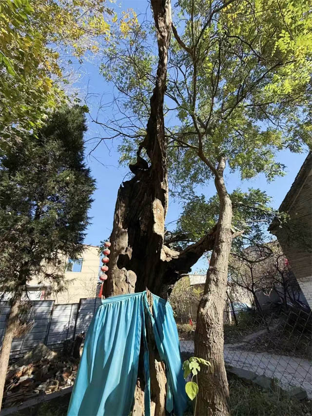 数百年的繁茂生长下,槐树一度长到了8米之高,树干粗壮笔挺,需要三个成年人伸手才能完全合抱。岁月无声,老槐树与添庄村也建立起了一种超越时间的生命连结。直到现在,不少村民们仍相信这棵槐树是有“灵性”的。