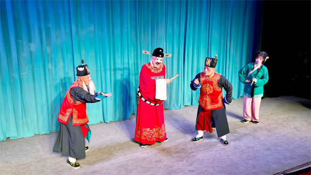 金不换头戴乌纱帽,身穿红袍,以经典的“七品县令”唐成形象登场。那熟悉的扮相,地道的韵味,刚一露脸,台下便爆发出热烈的掌声。